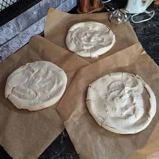 Die Kreise im vorgeheizten Ofen bei 140°C für etwa 30 Minuten backen, anschließend die Temperatur auf 100°C senken und für weitere 1,5 Stunden backen. Das Baiser am besten über Nacht auskühlen lassen.
