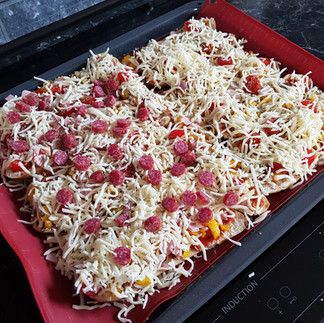 In einer Schale Tomatenmark, Ketchup, Olivenöl (nach Bedarf etwas mehr) und Pizzagewürz miteinander verrühren.
