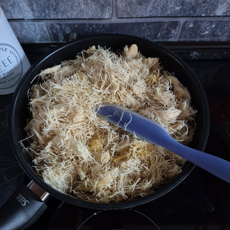 Das Kadayif etwas klein schneiden und mit Butter in einer Pfanne anrösten, danach die