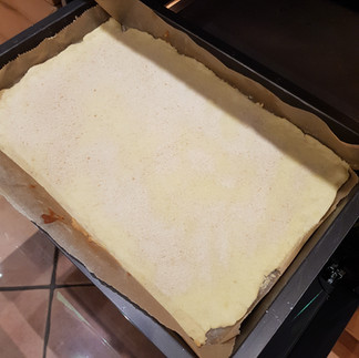 Den Teig auf der mittleren Schiene ca.8min vorbacken. Nach dem Backen mit ca.2 EL Paniermehl bestreuen und die Füllung gleichmäßig verteilen.