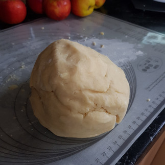 In dieser Zeit wird die Füllung vorbereitet, Äpfel schälen, das Kerngehäuse entfernen und in Würfel schneiden. Die Äpfel mit Zucker und Zitronensaft in eine Pfanne geben und kurz andünsten, bis die Äpfel etwas Flüssigkeit verloren haben. Danach abkühlen lassen.