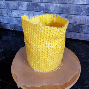 Eine ganz besondere Bienentorte die ich für mein Mann gebacken habe. Ich habe mich für eine kleine Springform (ca.18-20cm) entschieden, dann in fünf Böden aufgeteilt und mit Buttercreme bestriechen. Die Luftpolsterfolie verwendete ich für das Muster der Bienenwabe. Für dieses Rezept habe ich fast 3 gelbe Tuben mit Lebensmittelfarbe gebraucht, die je nach gewünschter Intensität der Farbe, etwas mehr oder weniger zugegeben werden darf.