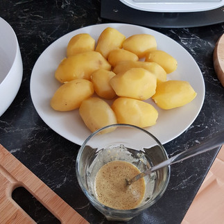 Zuerst die Kartoffeln gründlich waschen und mit Schale in einem großen Topf mit Salzwasser ca. 20-25min garen. Danach die Kartoffeln abgießen, abkühlen lassen und pellen.
