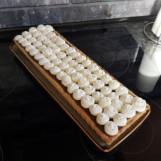 Die Creme in ein Spritzbeutel/Tortentülle geben und kleine Tupfen auf die Mohn-Tarte draufsetzen.