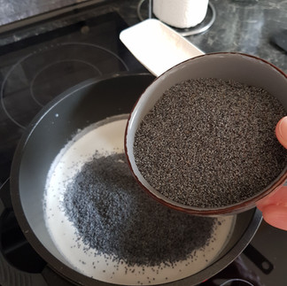Die Hitze reduzieren, den Mohn und Grieß zufügen, alles glatt verrühren und bei mittleren Hitze ca.5-7min köcheln lassen.