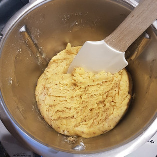 Mehl, Backpulver, Eier, weiche Butter, gemahlene Mandeln und 140g vom beiseite gestellten Puderzucker zugeben und alles miteinander 3min/Knetstufe verkneten.