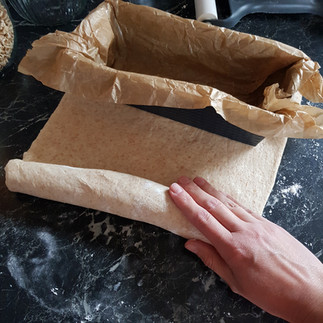 Den Teig in eine gefettete oder mit Backpapier belegte Kastenform legen.