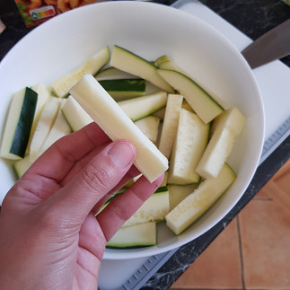 Zucchini waschen und in Stifte schneiden und in eine große Schüssel geben.