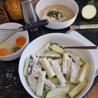 Zucchini Stifte panieren, dazu zuerst in die Eier Mischung tunken und dann in der Pankomischung wenden.